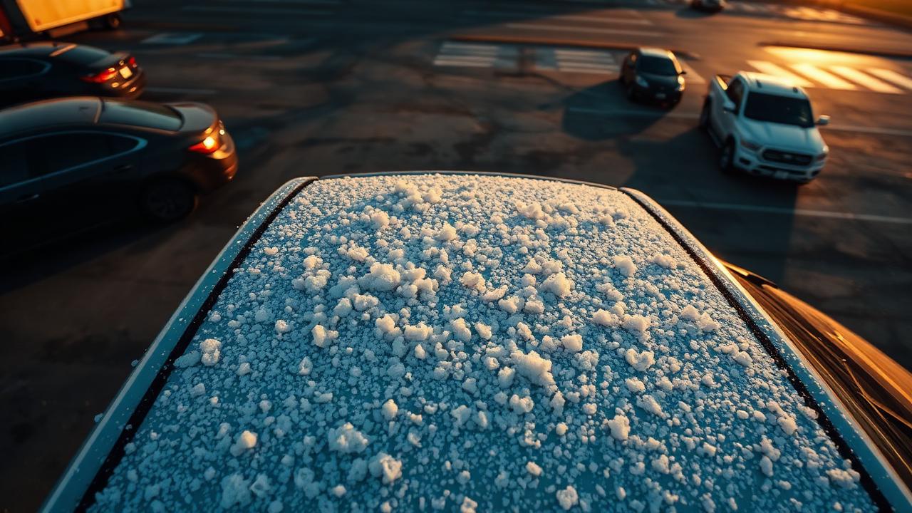 Before you move the vehicle, take photos of the surrounding storm — hail on the ground, broken branches, time stamps. Then photograph every damaged panel from multiple angles. Insurers love date-stamped photos.
